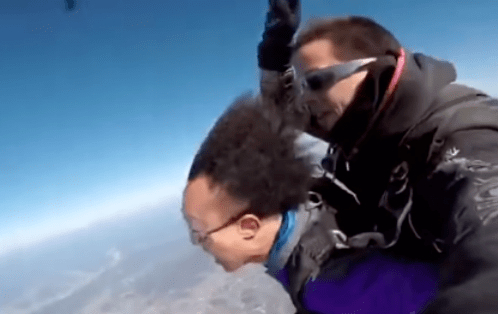 但陈奕迅有一次却晒出了自己跳伞的视频,在天空中由于阻力太大,陈奕旭的头发就被风吹成了这样,像极了钢丝球,薅下一把说不定还可以拿去刷碗。