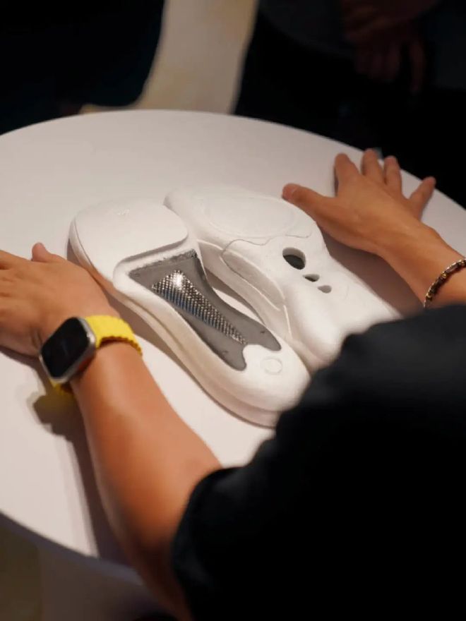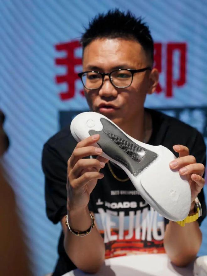 设计师孙明旭展示了巴特勒二代和驭帅ULTRA的碳?一体式中底,碳板在超临界发泡时直接包在?里,免去了胶水连接,?的整体回弹性能也得到进一步提升。