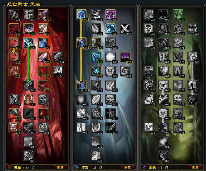 双光环DKT天赋,这个没什么大的争议,就是常规的43-26-2的天赋配点,这个天赋的优势其实是为了适应团队的工具人属性天赋,有血DK的憎恶之力,又有冰天赋的出20%物理加速,在10人团队里非常的受用。