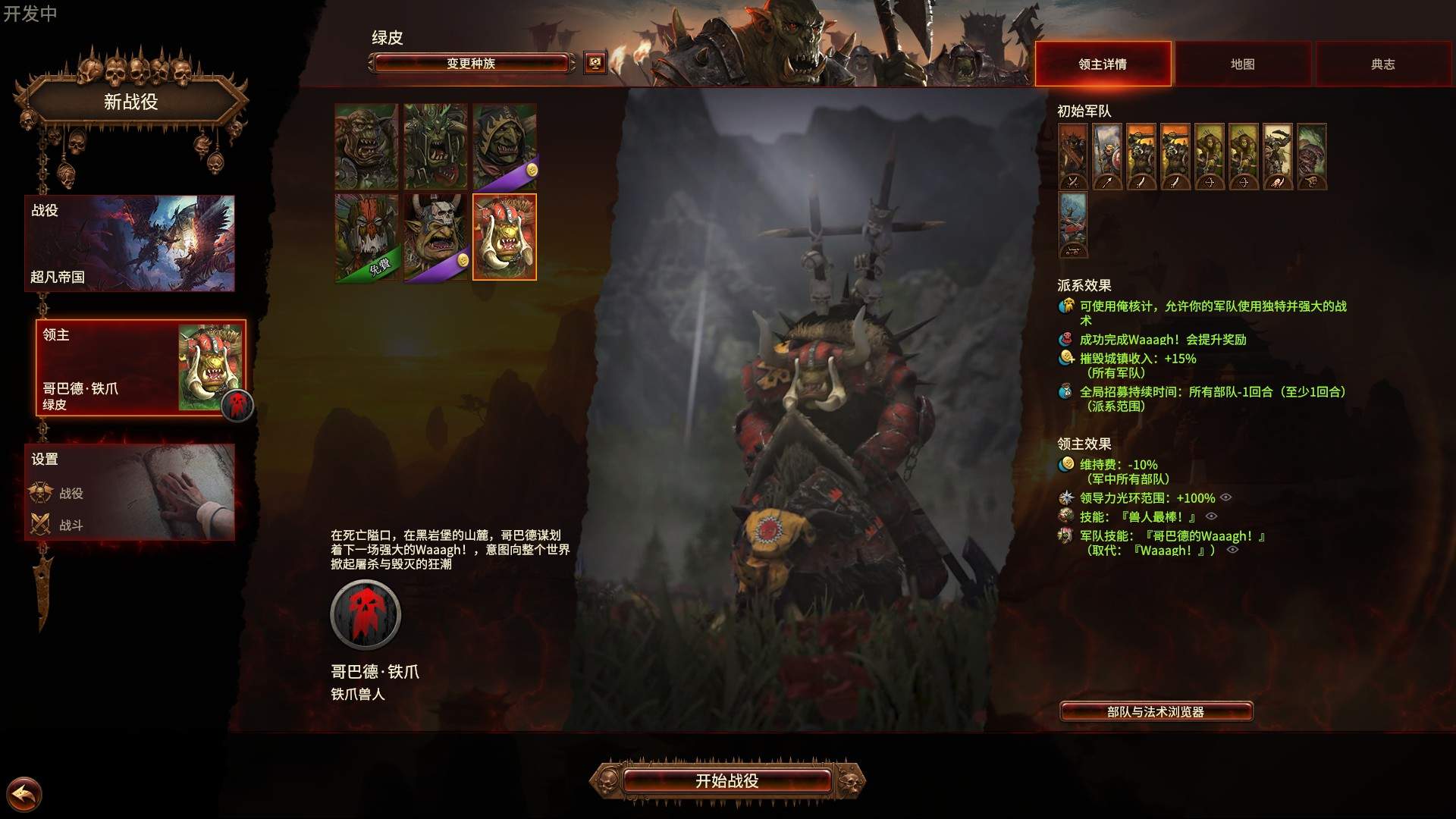 最聪明的绿皮指挥官横空出世!说实话这是笔者在本篇中最喜欢的一款,而其核心特色在于这个简单的“俺核计”上。不知道是否是本地化特意选择了字符,这个“核计”着实带有几分“核色彩”。阿巴德可以同时装备三个特殊部队战略,这些许战略要求部队按照特殊形式进行混编,高级策略需要满足一定的条件渐渐进行解锁。作为强调搭配的领主,阿巴德成功的将部队的使推广到了一个新的领域上,极大的改善了配兵的最优解思路,也丰富了绿皮的游戏性。至于策略的强度本身至少没有到需要把领主优化掉的地步,因此阿巴德绝对值得合计一下感受真正的“策略”带来的快乐。