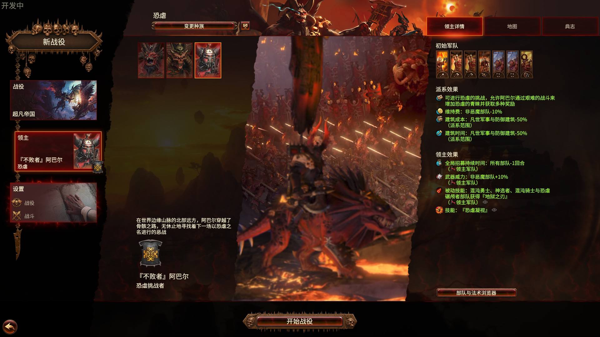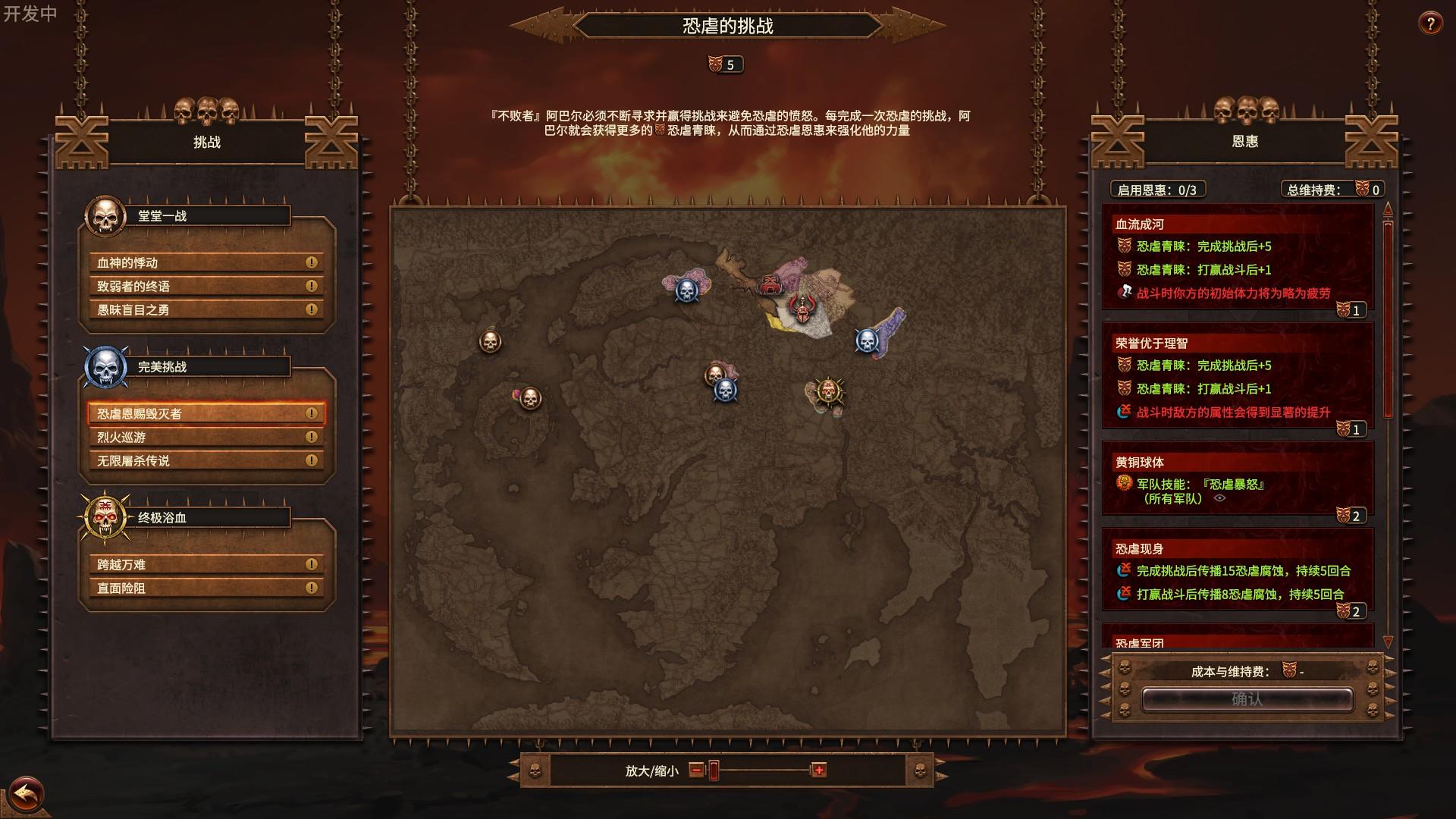 先来看本次更新中的免费领主。阿巴尔的派系特色在于恐虐的挑战机制。在完成了初始战斗解锁系统后,阿巴尔会依据所在的位置按照设定难度生成一系列特殊战斗从而获得战斗挑战的结果,玩家可以挑选目标积累青睐奖励。恩惠是消耗资源可以维持的专属部队BUFF,主要依靠战斗次数解锁。比较特殊的是,挑战会为阿巴尔提供目标的位置以及周围的视野,也因此除了挑战本身之外,该功能还有其他的战屡意义,对于追求快速推图的玩家可能有别样的吸引力。