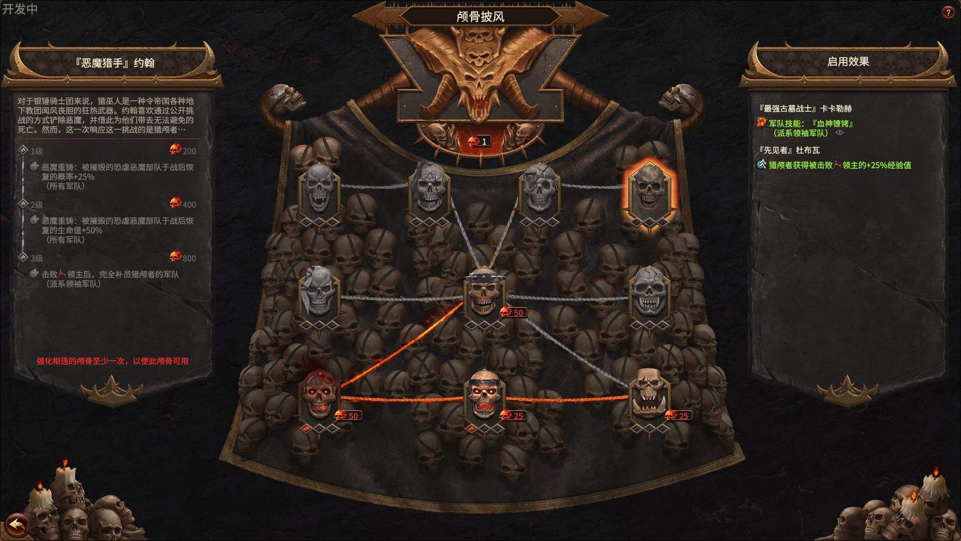 恐虐的付费领主猎颅者则带来了“颅骨披风”机制。同样关注战斗的情况下,猎颅者更专注于对敌方领主的攻略和屠杀。击杀敌方领主后,猎颅者会获得相应的精华用以强化自己的披风,每个层级需要不同的点数和战斗数目进行解锁。这里笔者直接丢出来这个百分百复原的buff来展示这个机制的强度了…然而实际上大部分战斗中披风不太能升到底层,一方面因为本领主的出生地周围有意识的被安放了多个领主用来快速展示战役机制,恐虐注重速推的特性也会将猎颅者的强化放大到一个非常恐怖的地步。
