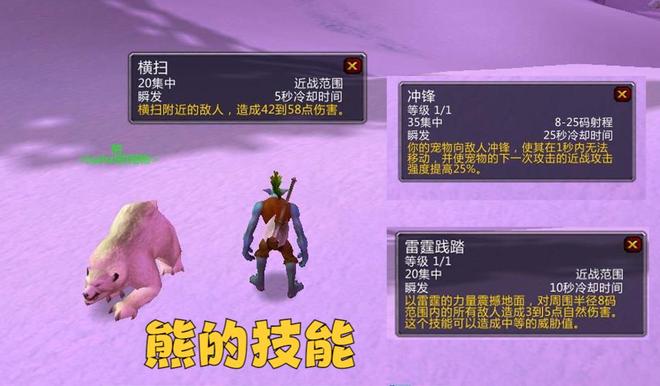 除了自身技能之外,坚韧系宠物天赋中还可以点出冲锋和雷霆践踏,如果给熊点了雷霆践踏的话,那么就是2个群拉技能,效果还是非常不错的。