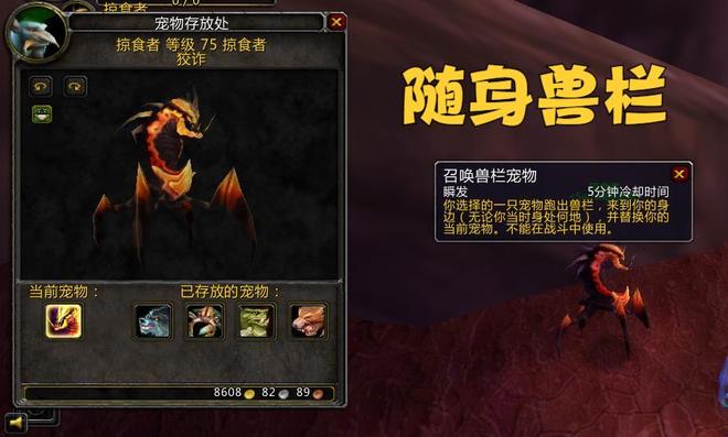 4,猎人的兽栏变成了4个,加上随身携带的宠物,一共可以保留5个宠物。同时猎人也获得了一个名为“召唤宠物栏”的技能,在任何时候都可以直接更换携带的宠物。