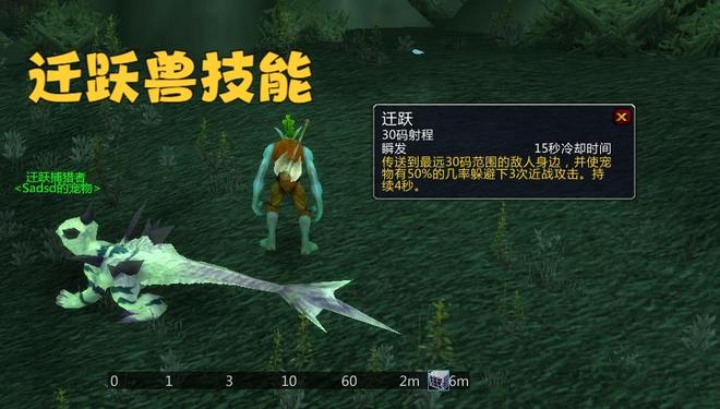第二个是迁跃兽,这款宠物自带一个名为迁跃的技能,效果是传送到目标身边,同时获得闪避技能,持续4秒。胖哥测试了一下,这个技能就是法师的闪现,不仅可以位移,还可以解除控制。